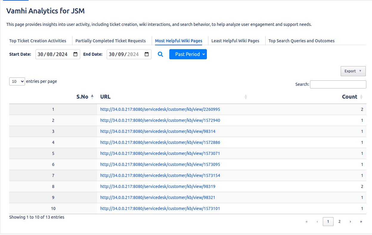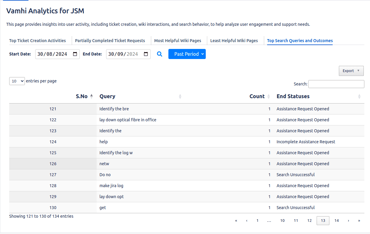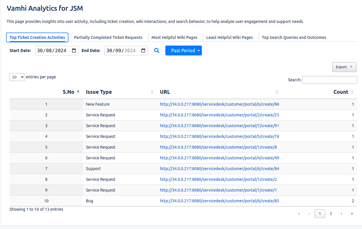 Track and analyze customer activities like ticket submissions, queries, and wiki interactions on the JSM Help Center, providing a clear understanding of user behavior.